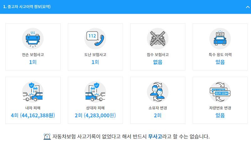 카히스토리를 통해 차량조회를 하시면 아래와 같은 사항들을 볼 수 있습니다.