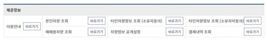 • 본인차량 조회, 타인차량정보 조회(소유자동의), 타인차량정보 조회(소유자 미동의), 매매용차량 조회, 차량정보 공개설정, 결제내역 조회 중 원하는 메뉴 선택하기