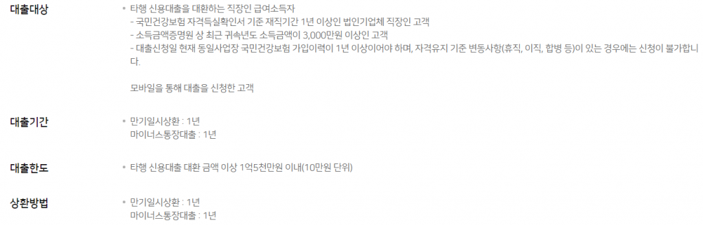 하지만 1금융권 대환대출은 조건이 까다롭기 때문에 다른 상품보다 이용하시기 어렵습니다.