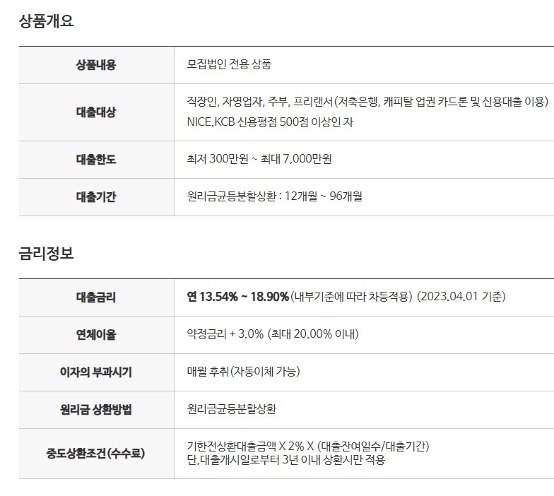 대출한도는 300만원에서 7천만원까지 나오고, 대출금리는 연 13.54%~18.9% 사이로 적용됩니다.
