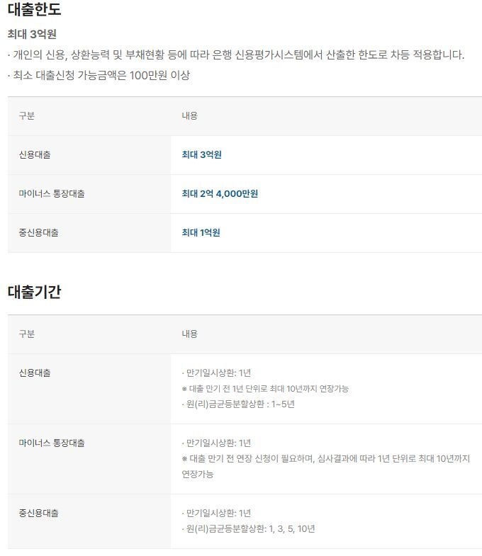 신용대출 기간 및 상환방법마이너스 통장대출 기간 및 상환방법중신용대출 기간 및 상환방법· 만기일시상환: 1년