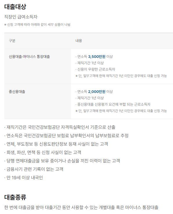 - 연소득이 3,500만원 이상 되시는 분, 재직기간이 1년 이상 되시고 신용이 우량한 근로소득자 (단, 일부고객에 한해 재직기간 1년 미만인 경우에도 대출 신청 가능)