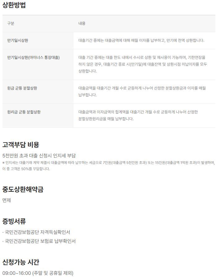 · 원(리)금균등분할상환: 1, 3, 5, 10년중도상환수수료는 모두 없고, 대출 가능시간은 오전 9시부터 오후 4시까지 신청 가능합니다. 참고로 주말, 공휴일은 대출이 불가합니다.