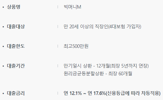 대출한도는 빅머니M보다 500만원 더 많은 1000만원까지 가능합니다.