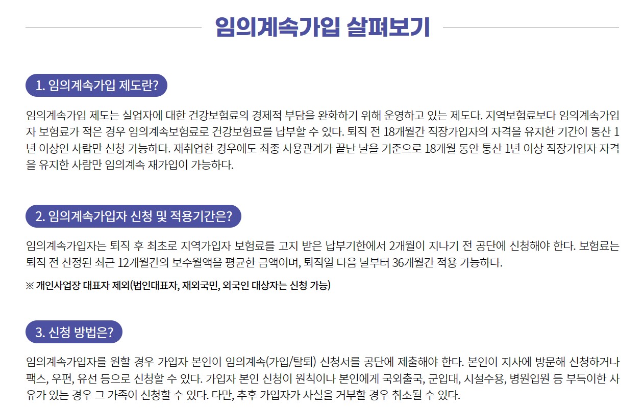 퇴직후, 직장에서 납부하던 건강보험료보다 납부해야 할 할 지역보험료가 더 많을 경우 임의계속가입을 신청하면 최대 3년까지 퇴직 전 직장에서 부담하던 수준의 보험료로 납부하실 수 있습니다