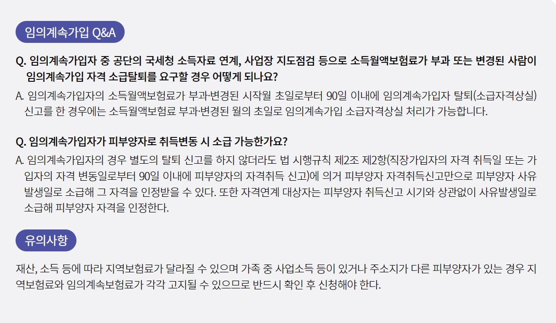 임의계속가입자를 원할 경우 가입자 본인이 임의계속(가입/탈퇴) 신청서 및 가족관계증명서를 공단에 제출해야 합니다