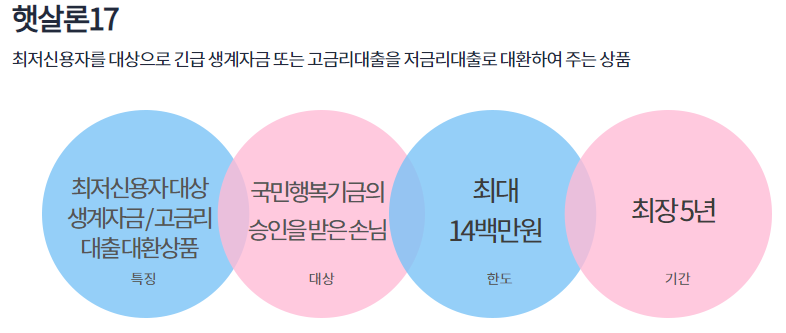 서민 정부지원대출 중 20%가 넘는 고금리대출을 저금리대출로 대환할 수 있게 도와주는 상품이 햇살론17 입니다.