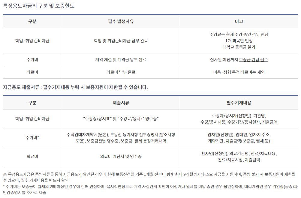 보증대상자금보증한도용도확인 방법학업·취업준비자금 최대 900만원 학업·취업 관련 수강증 및 영수증 등 의료비 의료비 영수증 주거비 주택임대차계약서(원본), 부동산 등기사항 전부증명서(말소사항 포함),