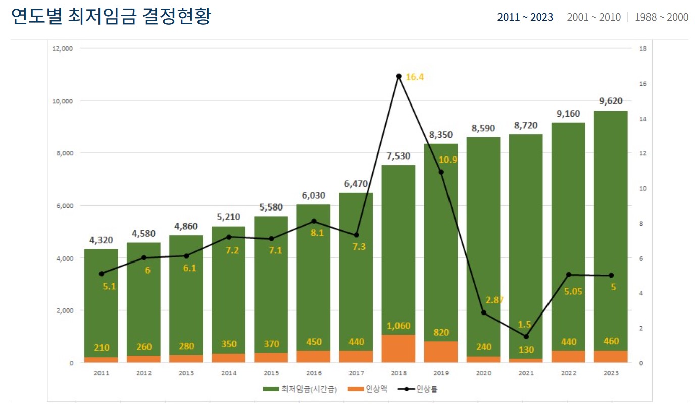 2023년의 최저임금은 2022년 대비 약5.0%인상된 9,620(2022: 9,160)이었습니다