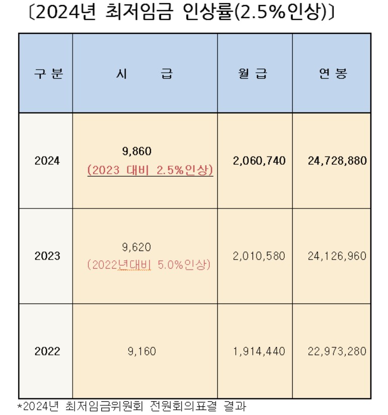 • 2024년 최저임금 월급수령액 9,860원(2.5%)인상, 노동계반발