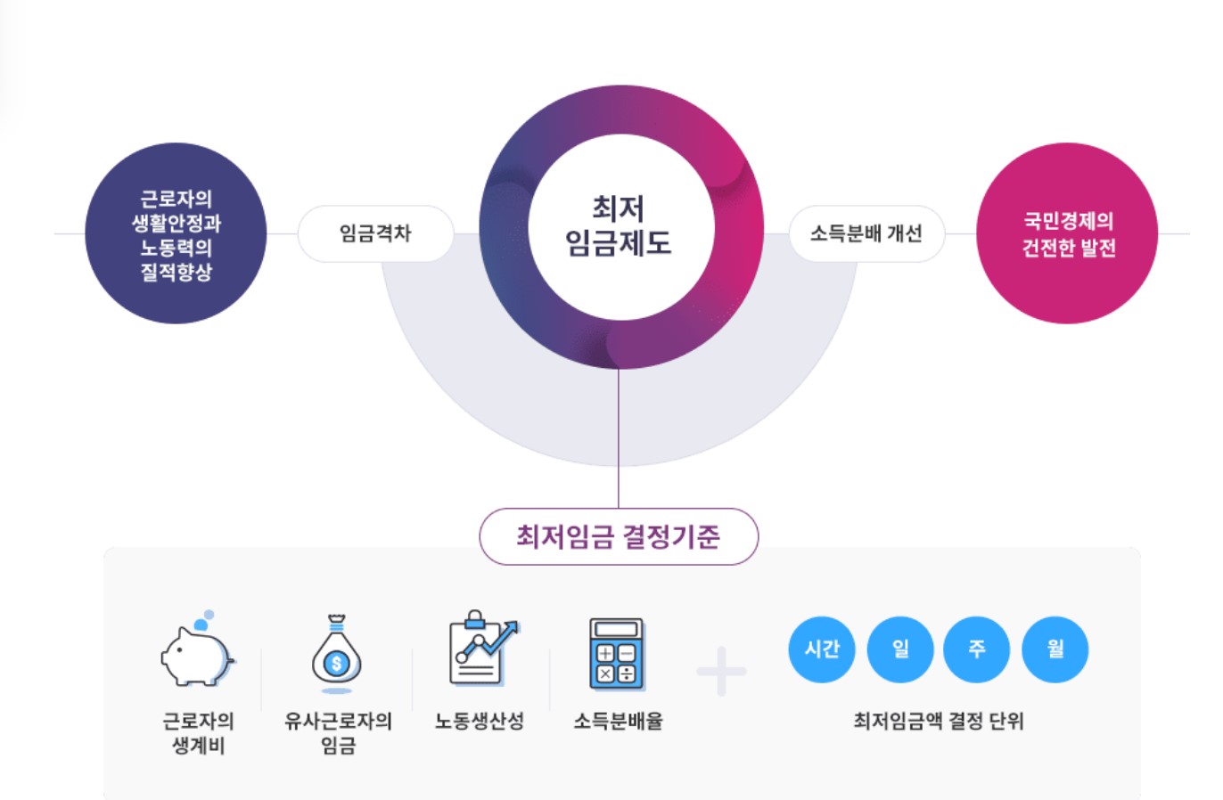 최저임금제도는 근로자에게 최저 생계수준을 보장하도록 하여 생활안정과 노동가치의 질적향상 바탕으로 국민경제의 건전한 발전을 목적으로 하고 있습니다