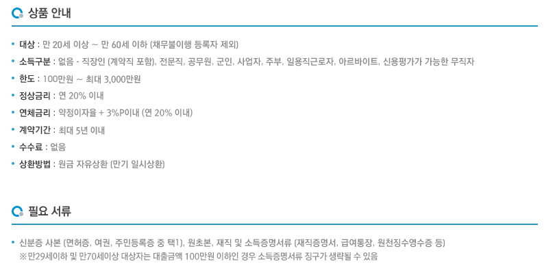 대출금리가 대부업체 대출이라 높은 편이지만 대출조건은 까다롭지 않아 대부분 이용하실 수 있습니다.